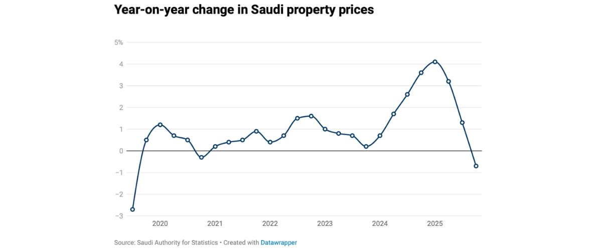 Property prices in Saudi Arabia have declined for the first time in five years, official data shows. The real estate price index fell 0.7 percent in the final quarter of 2025 compared with a year earlier, driven mainly by a 2.2 percent drop in residential prices. The decline marks the steepest quarterly fall since 2019 and the first contraction since late 2020.